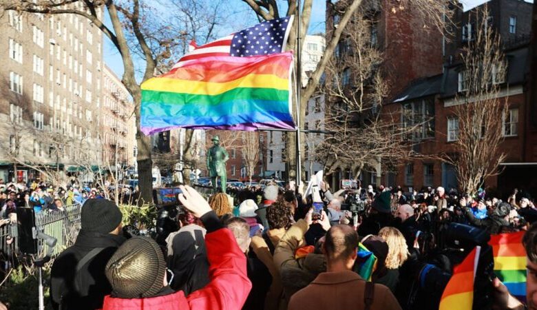 Símbolo foi recolocado no Stonewall National Monument sob aplausos de manifestantes após memorando federal restringir exibições em parques nacionais